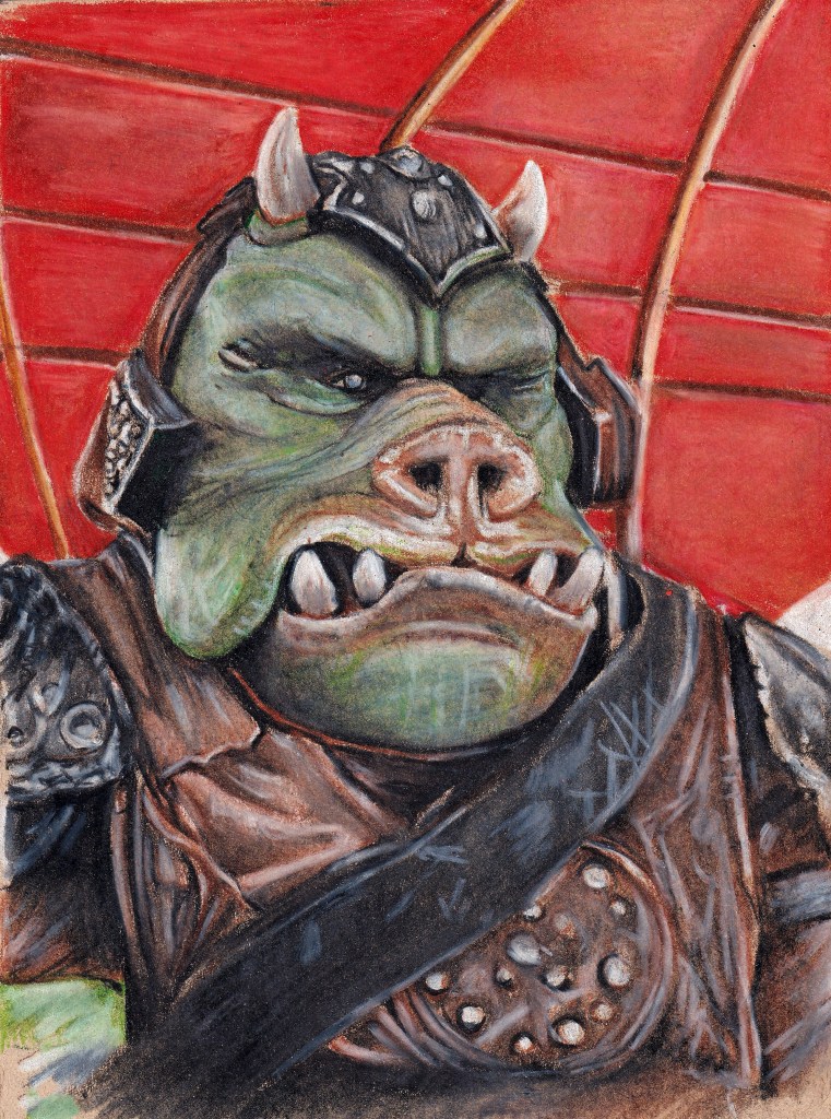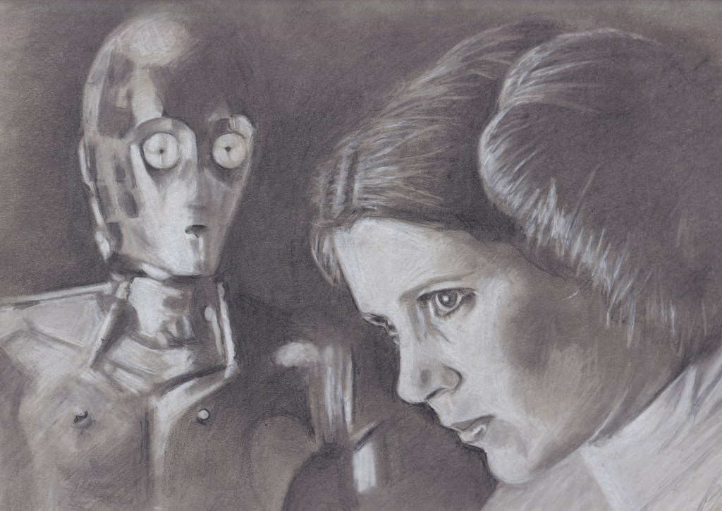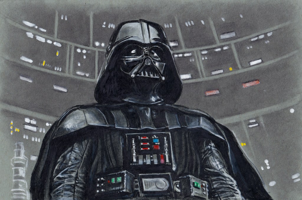Thematically following Lucas’ nod to WWII, I wanted to sketch Tarkin as he might appear in a military photograph of the 1940s. Here, Tarkin’s furrowed brow deceives us. Care and even anxiety may be deciphered on his face, but it’s the concern for functionality –the middling worry of diminished position, that his place in hierarchy may be disrupted, that his trust in Vader may be misplaced, that, as Vader replies to Moff Jerjerrod in Return of the Jedi: ‘The Emperor is not as forgiving as I am.”