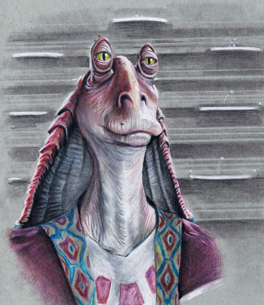 While most Jedi are somber and listless, I wanted to depict Qui-Gon in a moment of joy, as he delights in the child Anakin’s playful attitude.